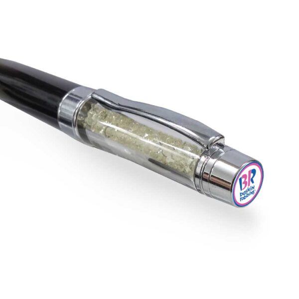 Crystal metal pens are luxurious high-quality ballpoint pens. They are created with shiny metallic material and crystals on glass. Thus, it is glossy and durable at the same time. This pen comprises a barrel. The lower part comprises glass with crystals while the upper part is black. The crystal part gives a shiny finish. Thus, making it more stylish. Apart from the barrel, it also comprises a silver tip and chrome clip. Thus, it’s a perfect promotional metal pen for business promotion. The chrome clip at the end of the pen works like a holder. Thus, you can attach the pen to your shirt or bag. There is a round logo area on the top of the pen. Thus, you can also use these promotional metal pens for events.