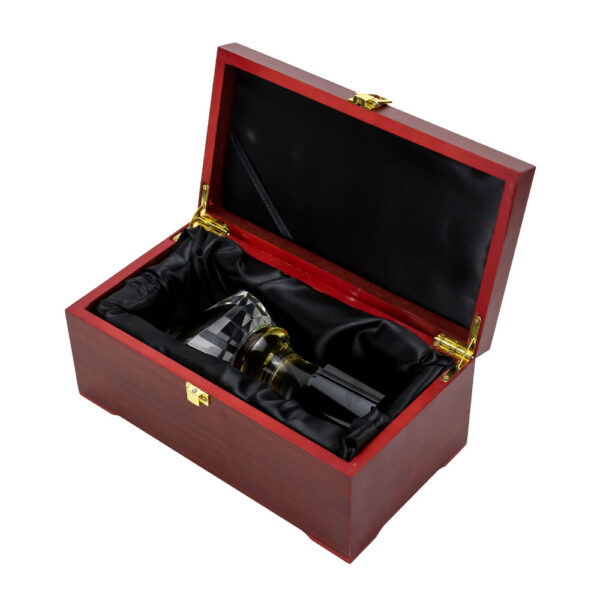 Crystal glass trophy 20 cm with round black base presented in the mahogany color wooden box.