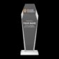 Cuboid-shaped crystal awards with wooden bases, and packed in a wooden presentation box.