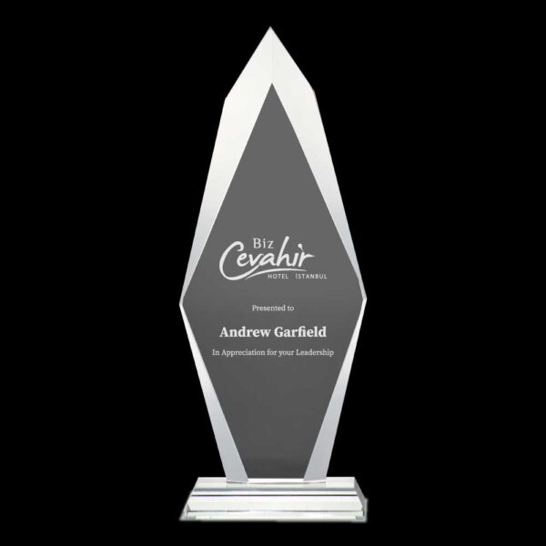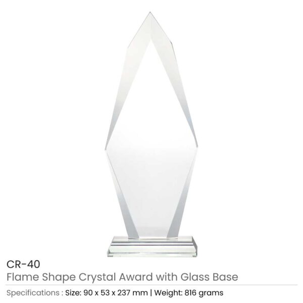 Flame shape crystal awards with a glass base are packed in the black carton gift box.