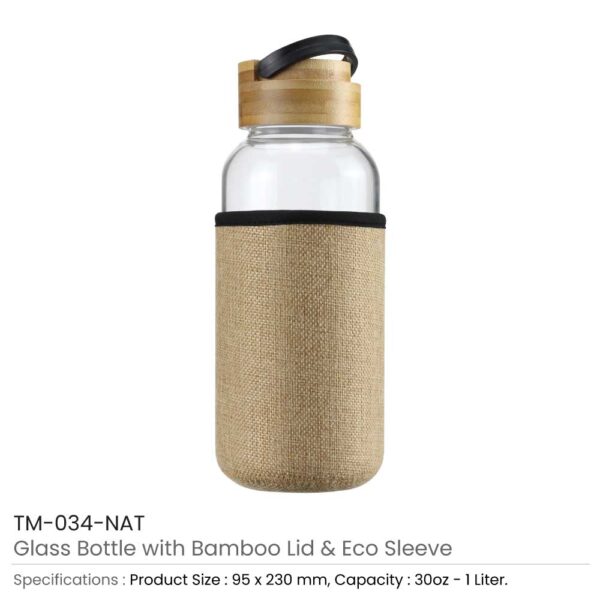 Clear glass water bottles with eco-sleeve and bamboo lid, Capacity: 33 oz (1000 ml).