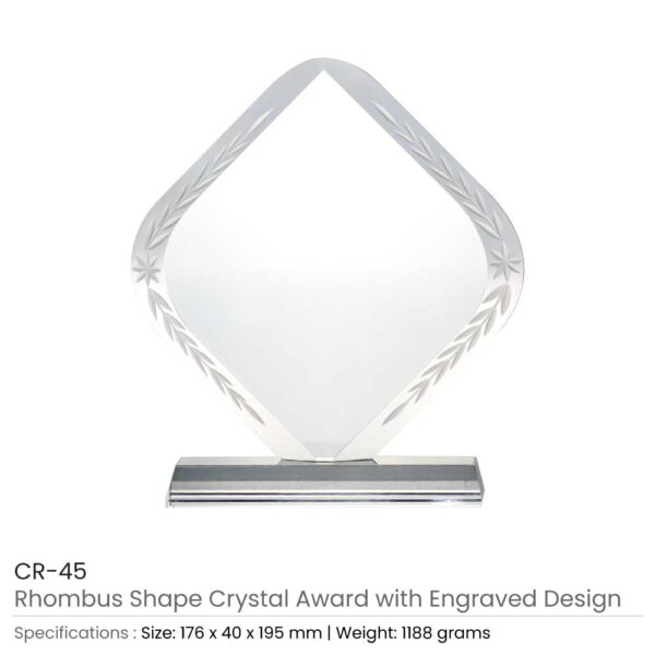 Rhombus shape crystal awards with an engraved design and packed in a black carton gift box.