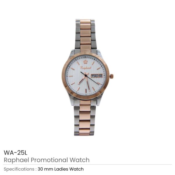 Ladies’ and gents’ watches are famous promotional watches from Raphael. These branded wristwatches had crafted with water-resistant stainless steel. So, it has a classy yet elegant appearance. The size of the ladies’ watch is 30 mm, while the size of the gent’s watch is 43mm. It has a silver chain with rust color parts in the middle. While the frame is also in rust color. Unlike the frame, its dial is white. However, its needles and markings are rust color. Thus, overall it’s a very stylish watch. Moreover, it has two small areas on the dial. One is used to display the date while the other displays the day.